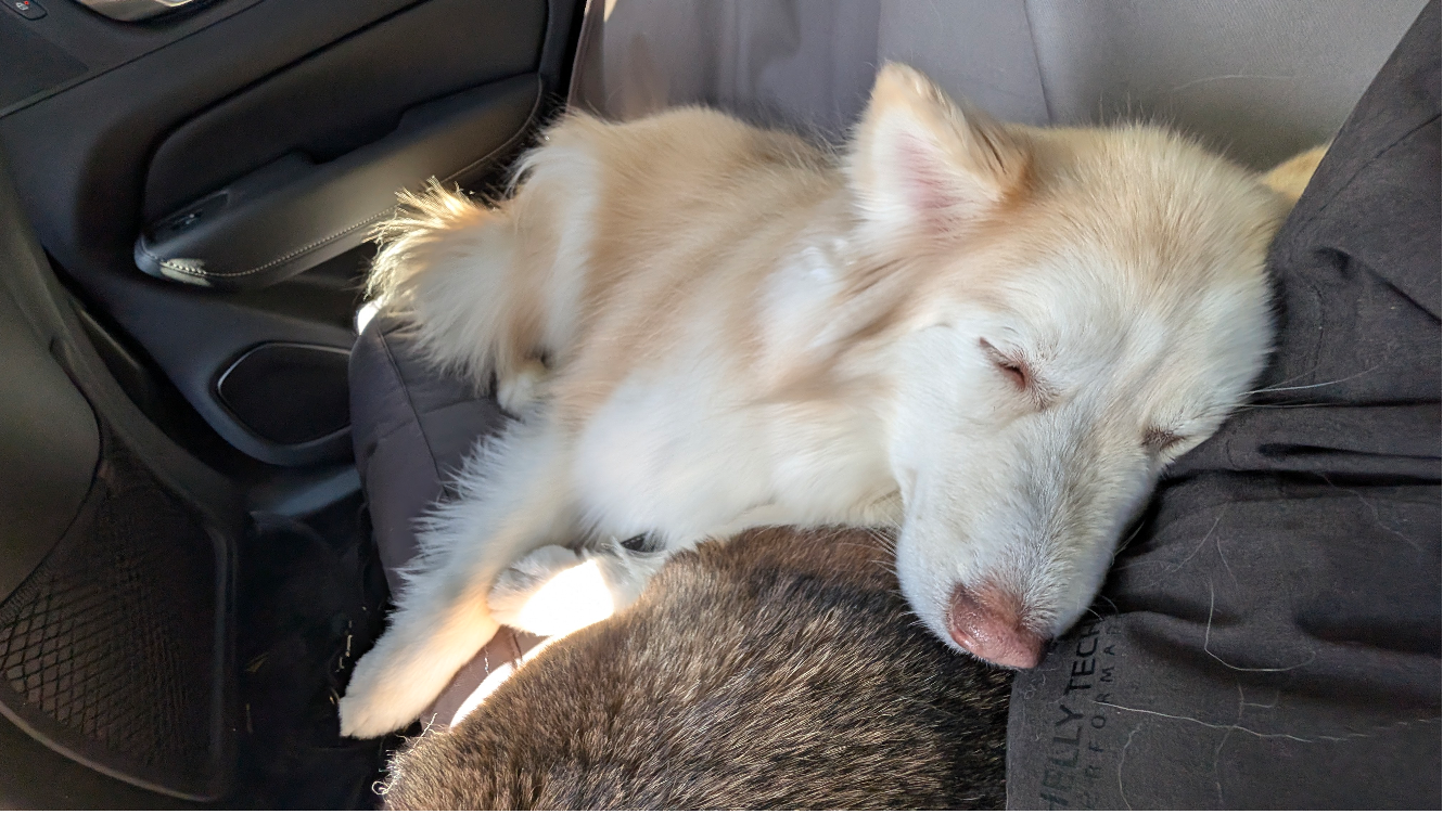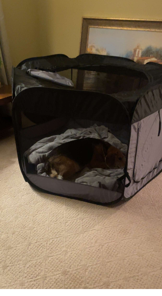 Ivy in her doggie playpen so she doesn’t try to jump on the bed or run around
