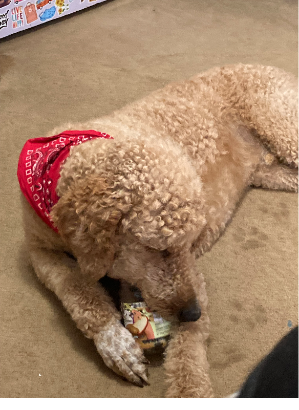 Let him lick the empty peanut butter jar, needless to say I think he is enjoying it